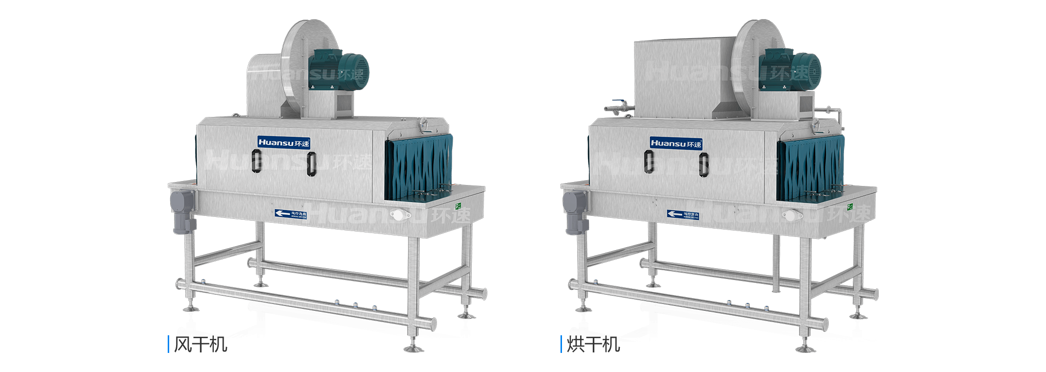 清洗段后端可灵活配置风干机、烘干机,用于快速除水。风干机配备环速自主研发的风刀装置,可将空气泵产生的压缩空气转化为片状的高速气流,剥离容器表面残留的水;烘干机在风干机的基础上额外增设了加热装置,产生的是高温高压气流,除了具有风干功能,还可以利用热量加快水分蒸发,进一步提高除水效果。